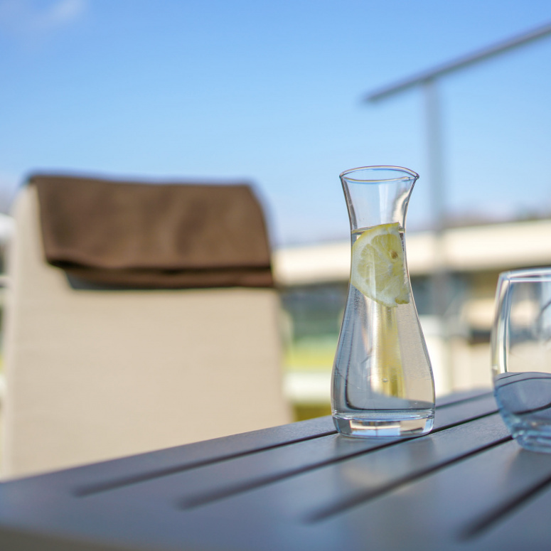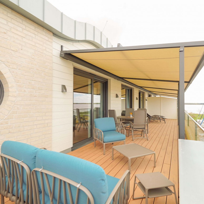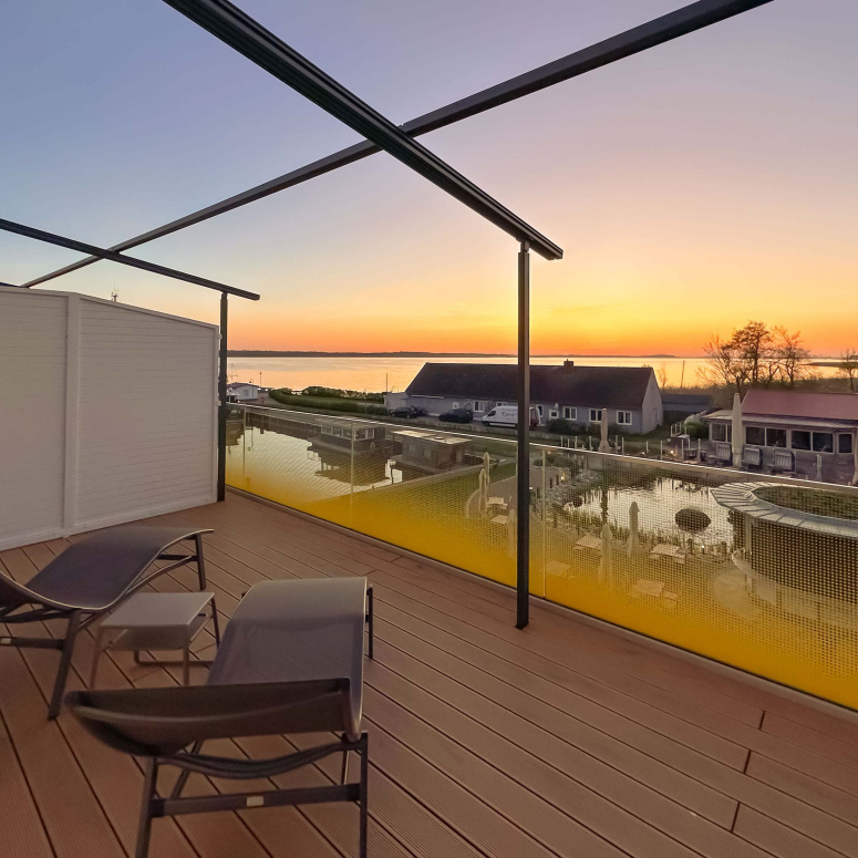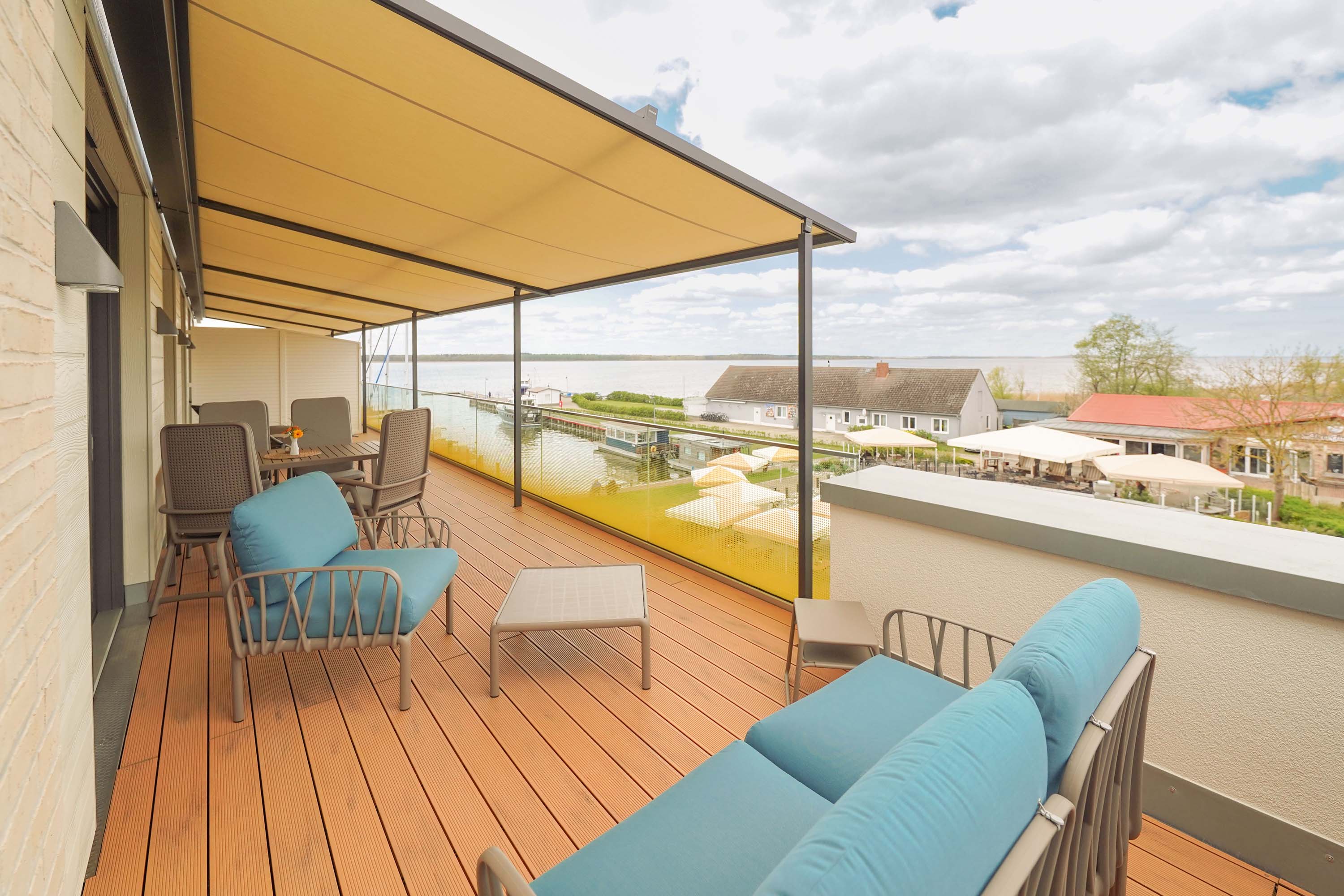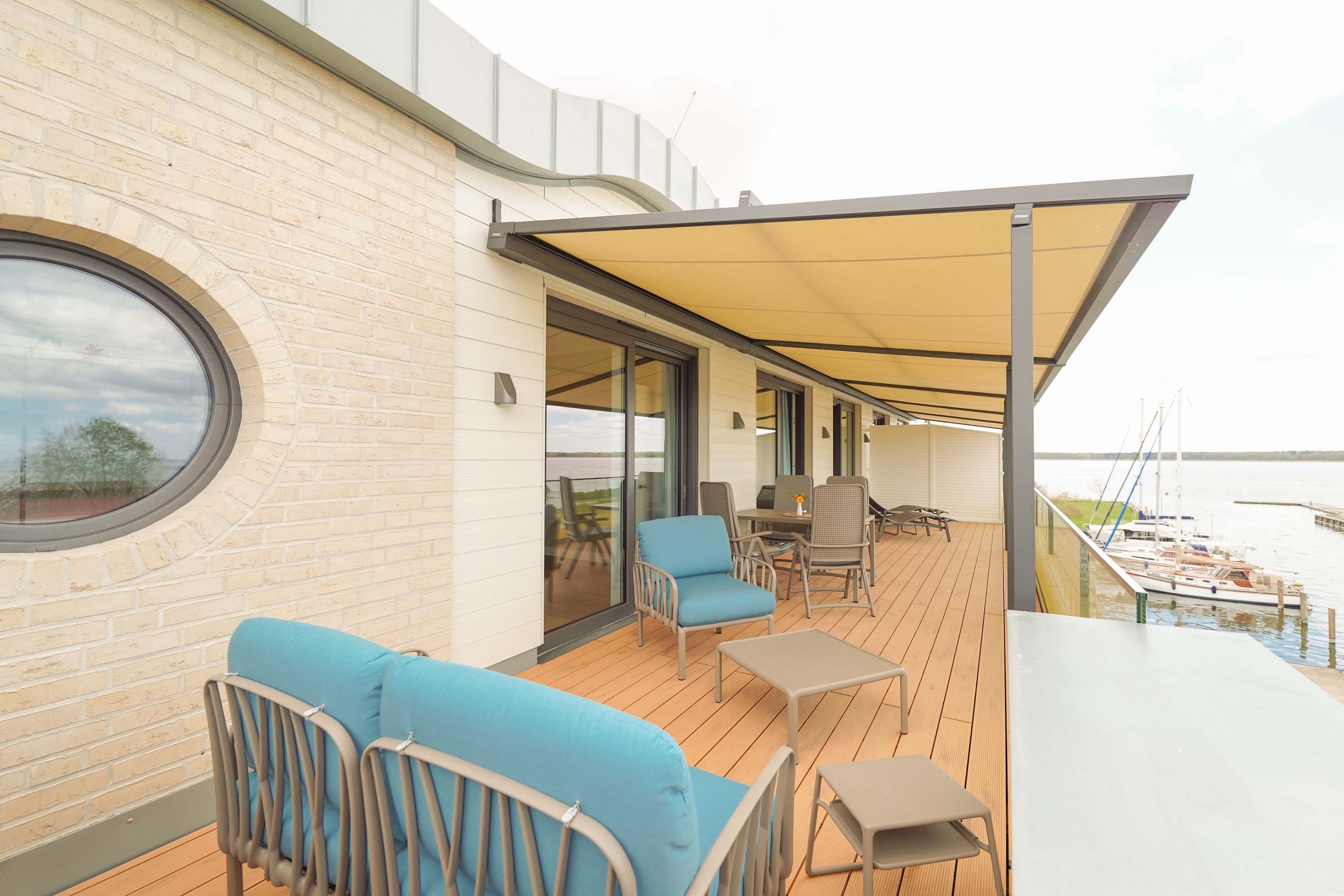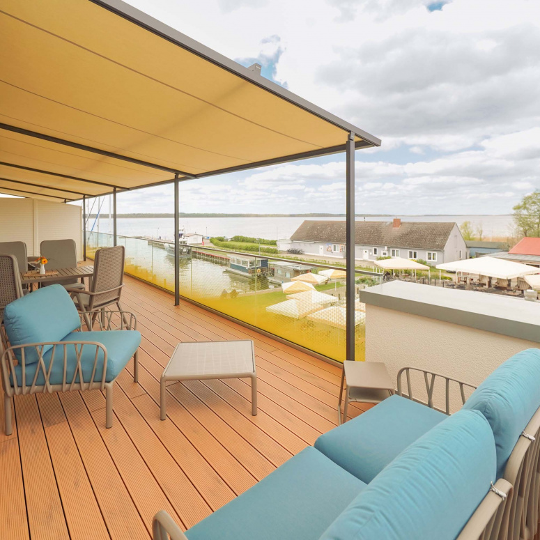 Für eine entspannte Heißzeit fahren Sie per Fahrstuhl auf das Dach unseres Appartement-Hauses. Hier können Sie gemütlich in einer finnischen Sauna entspannen. Dabei heizt der Ausblick auf Hafen und Peenestrom Ihre gute Laune an. Für einen erfrischenden Abschluss sorgt unsere Außendusche auf der 40 qm großen Dachterrasse. Versteckt vor fremden Blicken, haben Sie freie Sicht auf die nahen Wälder und genießen mit jedem Atemzug die reine Natur. Wenn Sie noch mehr schwitzen wollen: Im schräg gegenüberliegenden „Leuchtturm“ ermöglicht Ihnen ein kleiner Fitnessraum eine Extraportion Training am Tag.