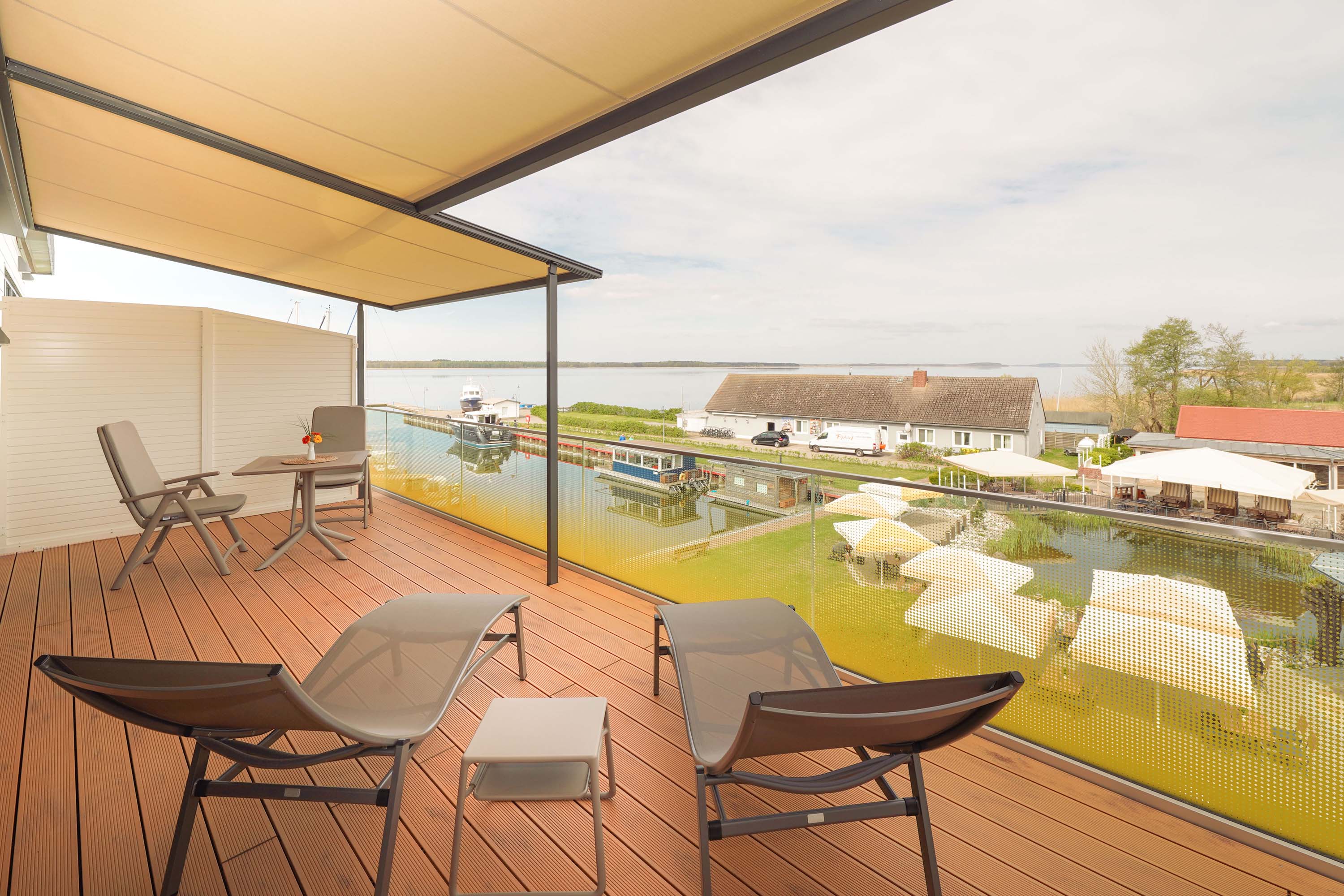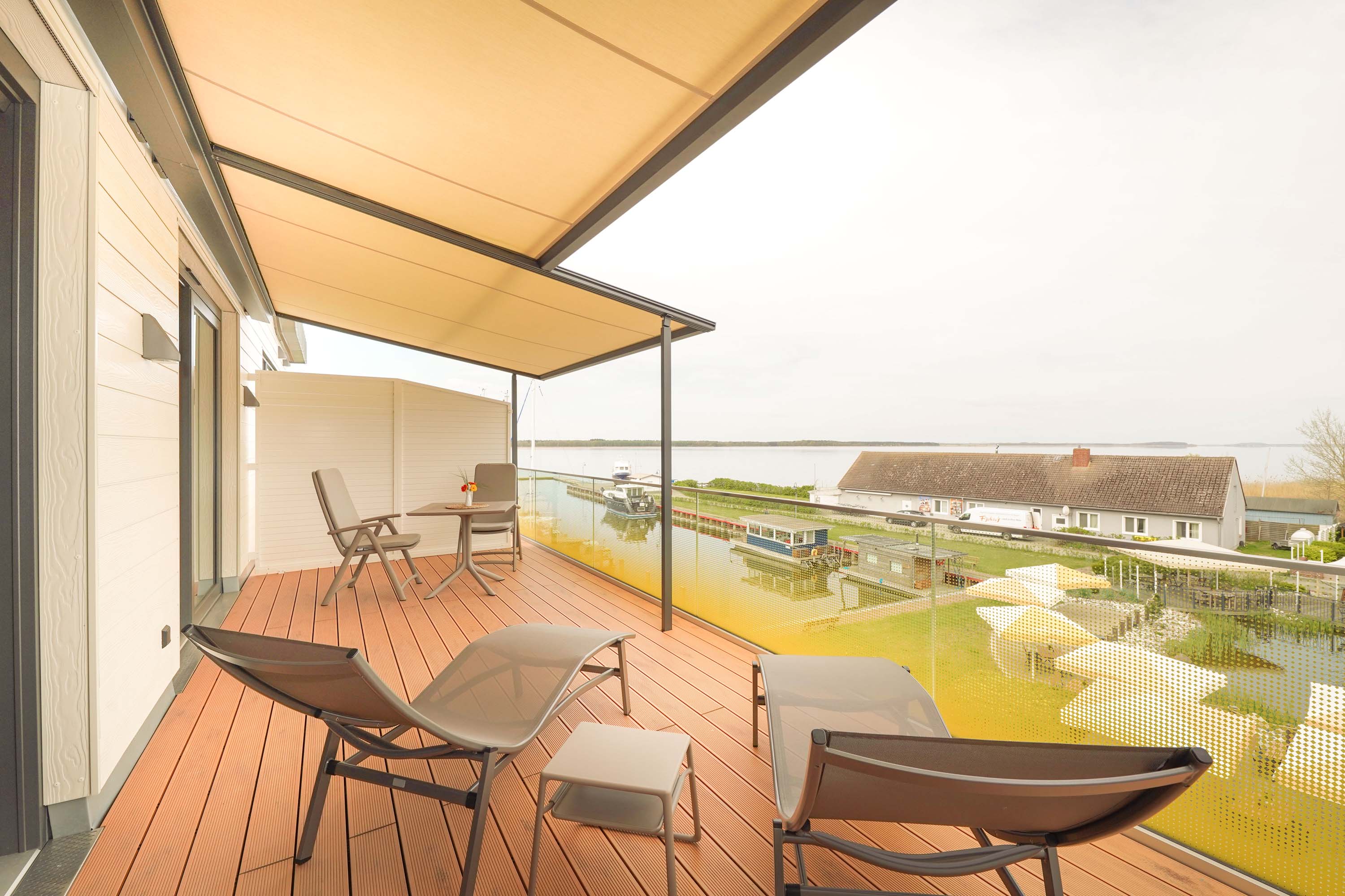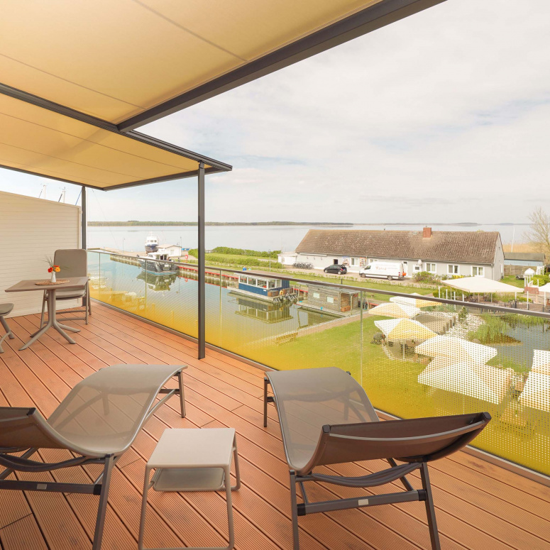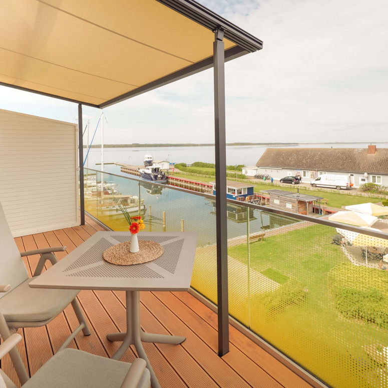 Für eine entspannte Heißzeit fahren Sie per Fahrstuhl auf das Dach unseres Appartement-Hauses. Hier können Sie gemütlich in einer finnischen Sauna entspannen. Dabei heizt der Ausblick auf Hafen und Peenestrom Ihre gute Laune an. Für einen erfrischenden Abschluss sorgt unsere Außendusche auf der 40 qm großen Dachterrasse. Versteckt vor fremden Blicken, haben Sie freie Sicht auf die nahen Wälder und genießen mit jedem Atemzug die reine Natur. Wenn Sie noch mehr schwitzen wollen: Im schräg gegenüberliegenden „Leuchtturm“ ermöglicht Ihnen ein kleiner Fitnessraum eine Extraportion Training am Tag.