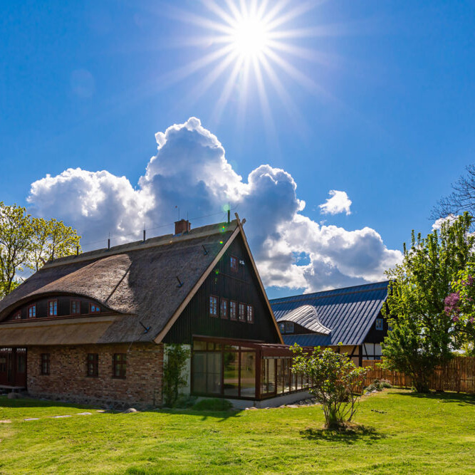 Das Haus Blaukehlchen im Sonnenhof ist ein 5-Sterne Ferienhaus mit viel Liebe zum Detail. Es bietet 5 Schlafzimmer, wovon eines über einen barrierefreien Zugang verfügt. Es gibt eine voll ausgestattete Wohnküche, 3 Bäder und eine große Sonnenterrasse im anliegenden Garten. Besondere Highlights sind die Hofsauna mit Blick in den Garten und eine private Badestelle mit Bootsanleger umgeben von Wiesen und Weiden.