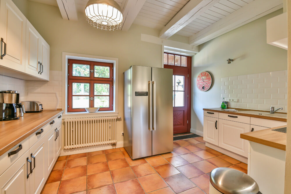 - Küche mit Kühlschrank, Spüle, Geschirr